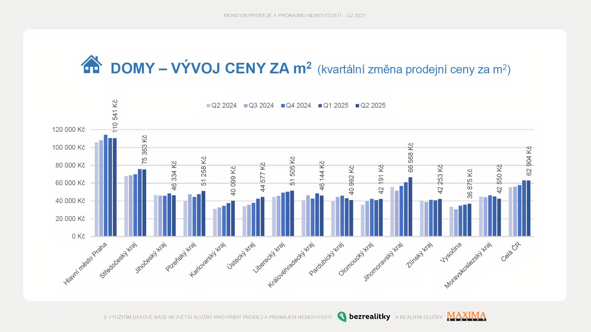 Zjednodušeně řečeno – i když ceny domů nerostou tak exponenciálně jako byty, rostou také, a to prakticky ve všech regionech. A přestože některé kraje stále nabízí relativně dostupnější bydlení, stoupající ceny signalizují trvalou poptávku a napjatý trh.