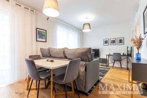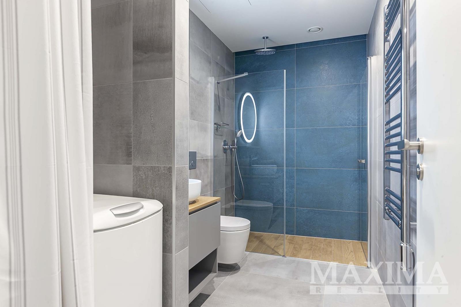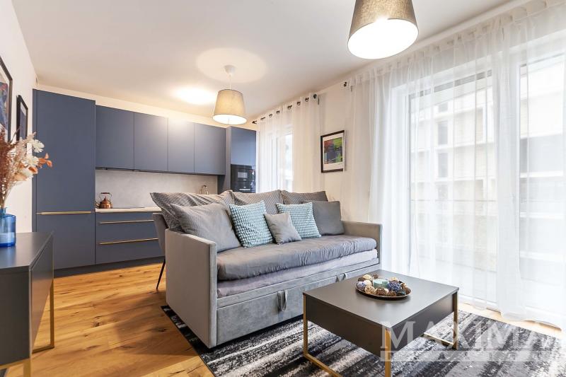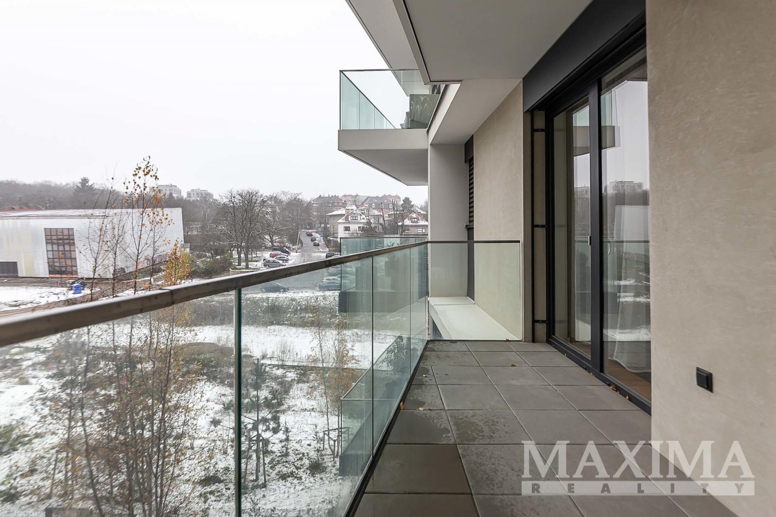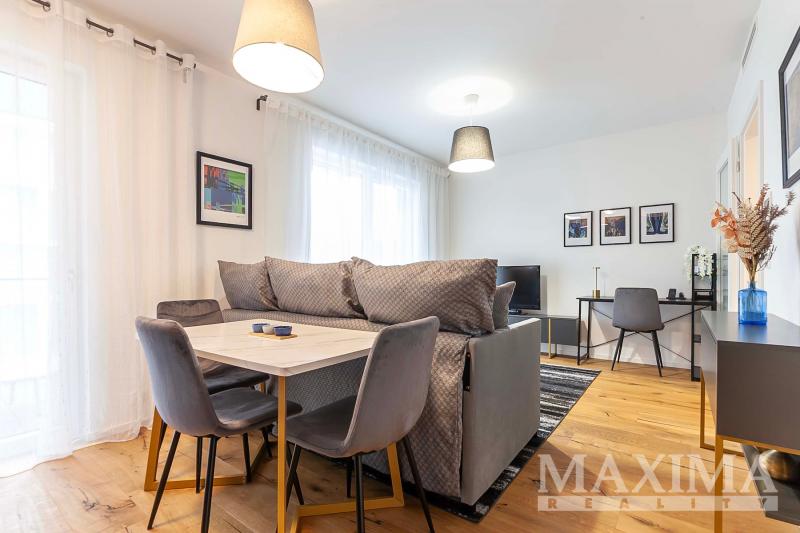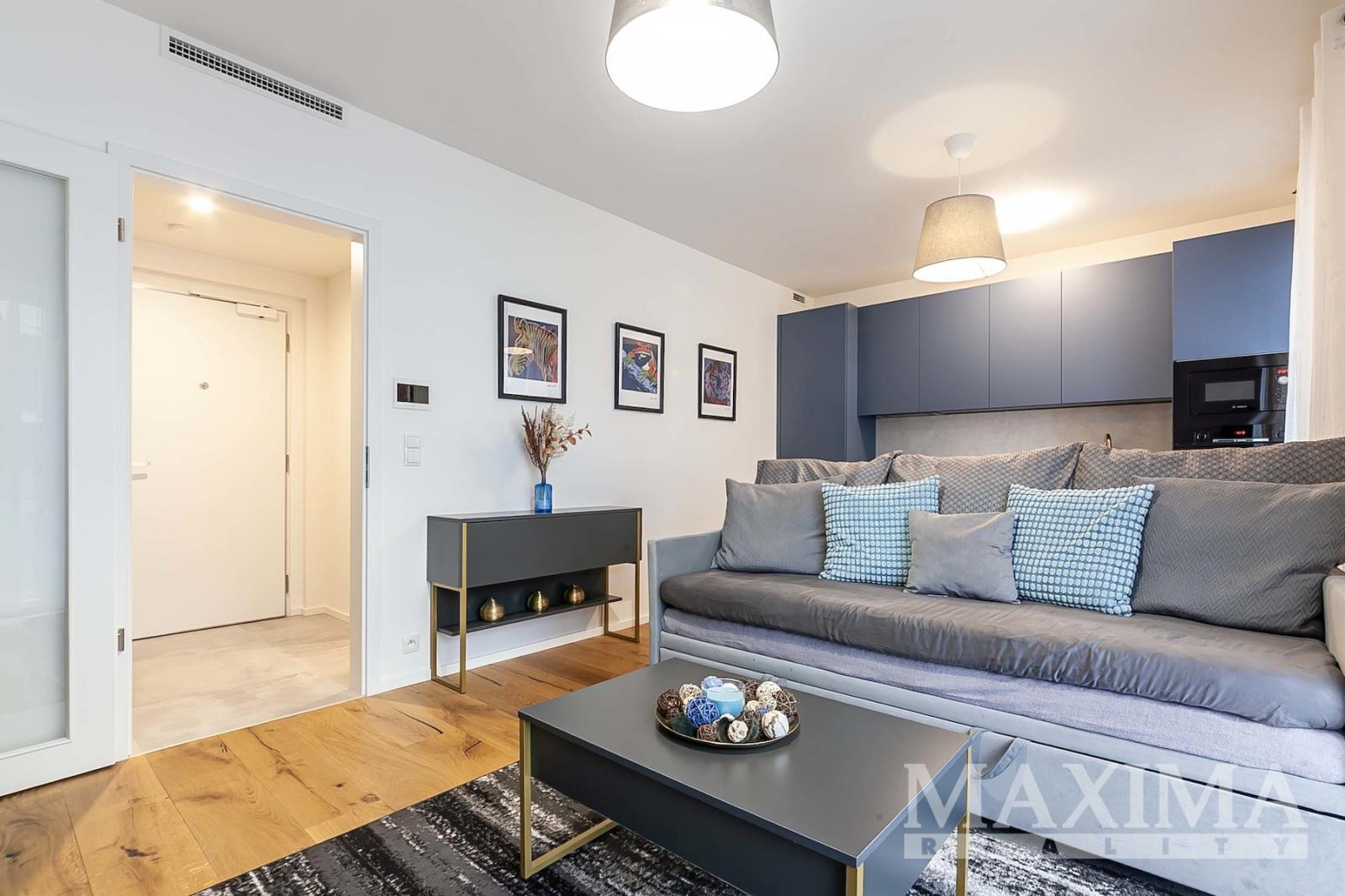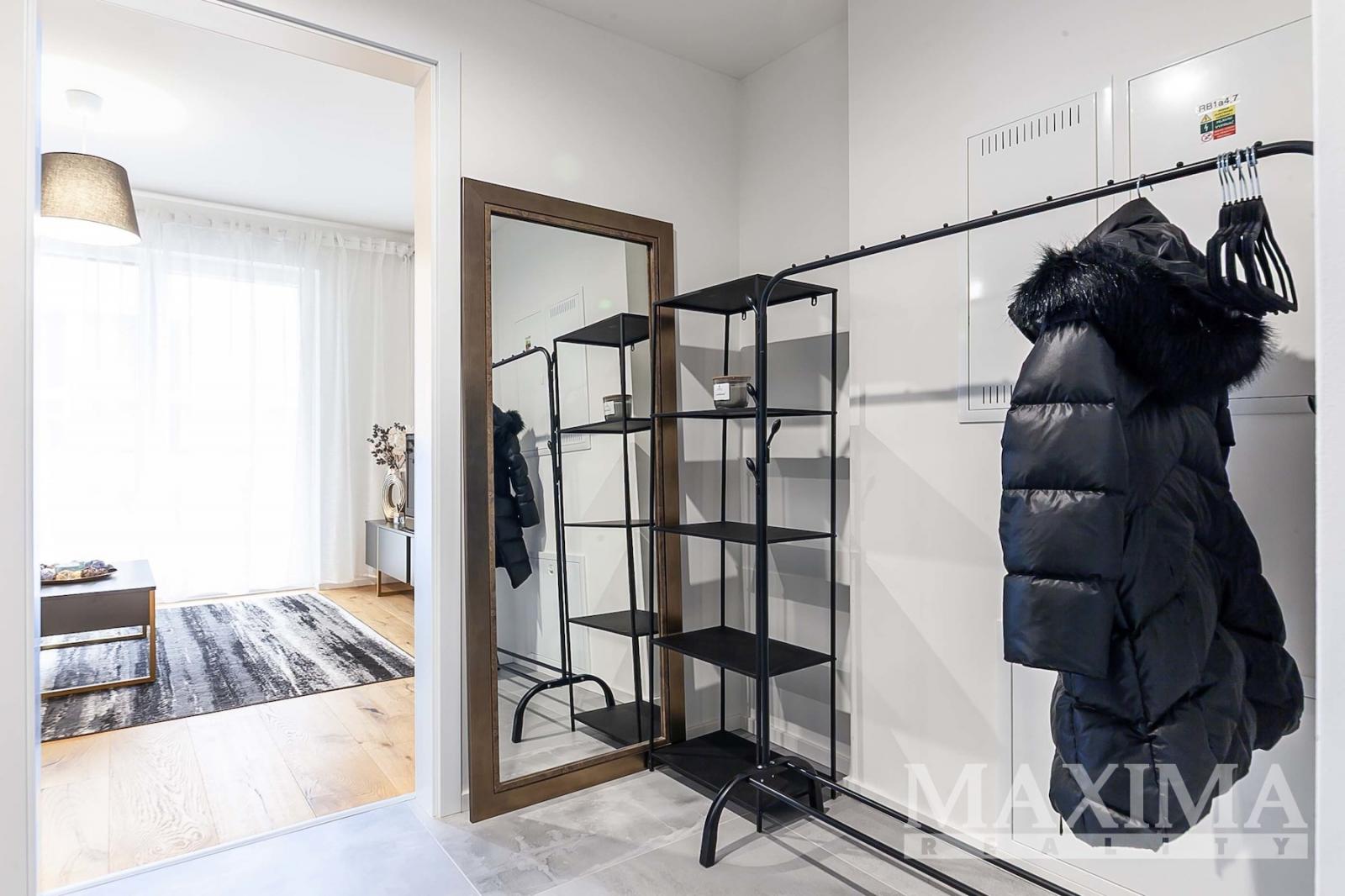 Rozkládací gauč (po rozložení s plnohodnotnou matrací), komody, psací stůl a TV; kuchyňský kout disponuje všemi vestavnými spotřebiči, jídelním stolem a židlemi. Koupelna je vybavena horem plněnou automatickou pračkou. Pro posezení na prostorném balkonu je k dispozici venkovní nábytek. Okna s izolačními trojskly jsou vybavena předokenními žaluziemi. Další součástí této chytré domácnosti je rekuperace.