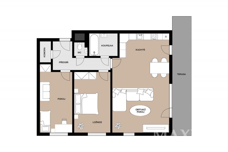Dispozice bytu zahrnuje světlý obývací pokoj s plně vybaveným moderním kuchyňským koutem, 2 samostatné neprůchozí ložnice, koupelnu s vanou, oddělenou toaletu a praktickou komoru, která nabízí dostatek úložného prostoru. V celém bytě jsou položeny kvalitní vinylové podlahy.