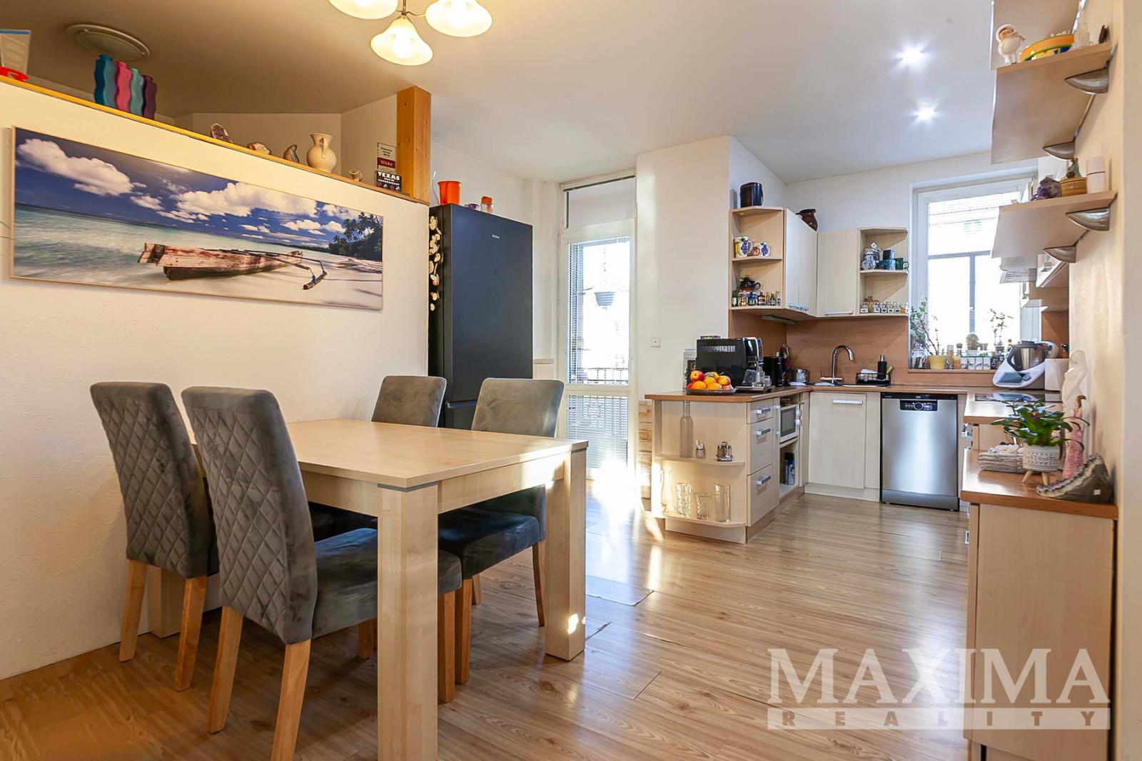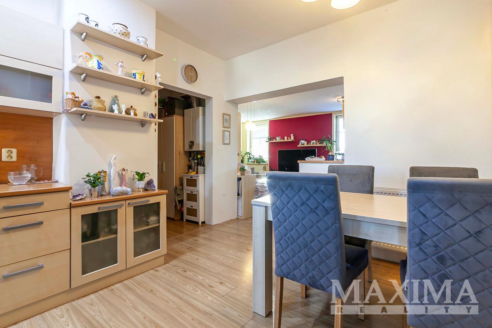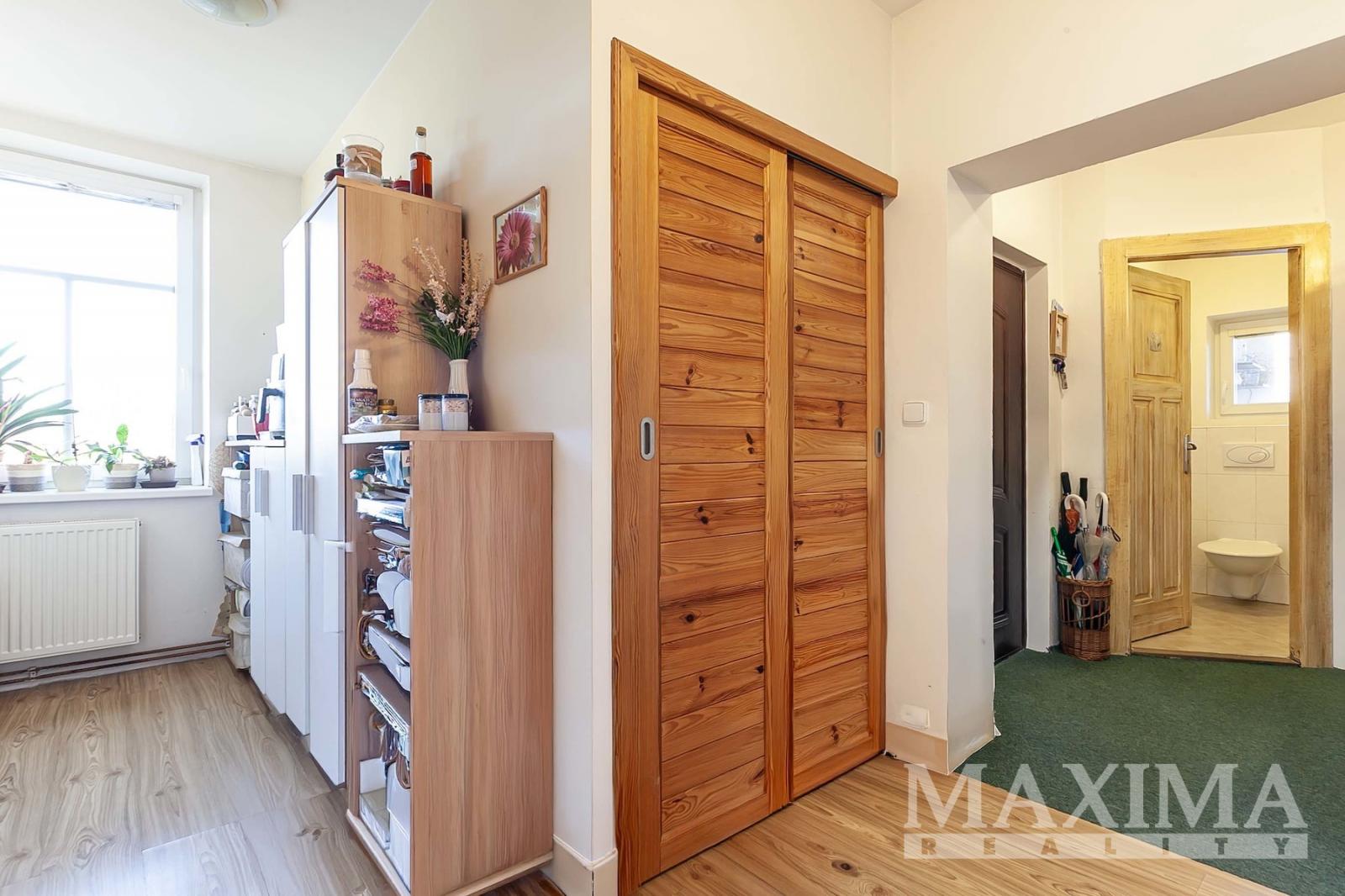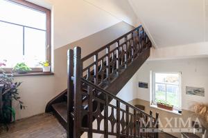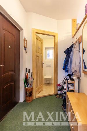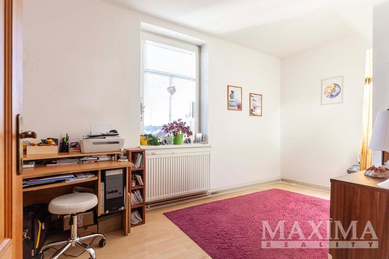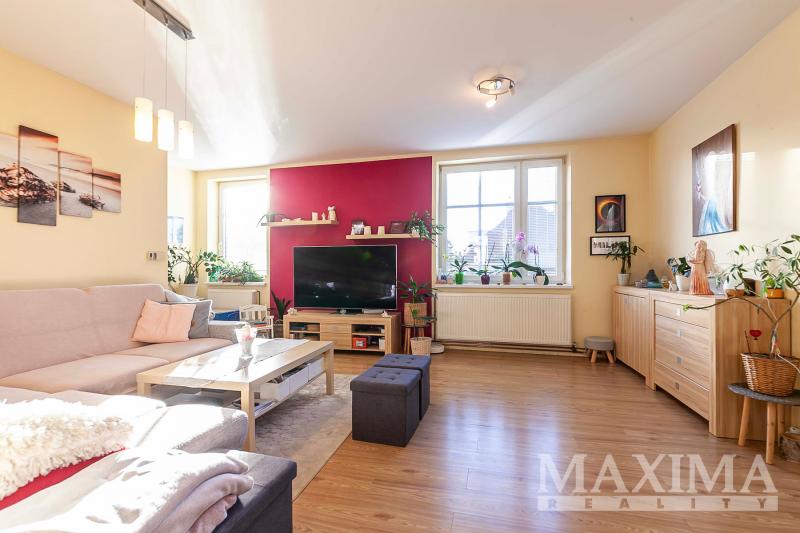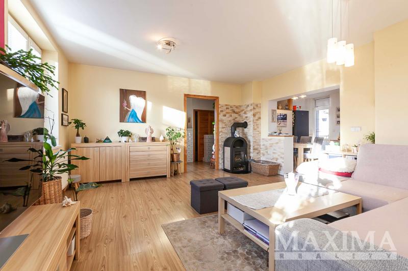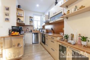 Dispozice bytu: vstupní chodba s prostornou šatnou, obývací pokoj s krbovými kamny, kuchyň s jídelním koutem, ložnice se šatnou, dva samostatné pokoje, koupelna s vanou i sprchovým koutem a prostorem na umístění pračky a sušičky, samostastné WC, balkón. K bytu náleží mimořádné možství úložného prostoru - tři sklepní prostory o celkové výměře 20 m2, dále půdní prostor a další půdní společný prostor. Vytápění a ohřev vody zajištěno plynovým kotlem.