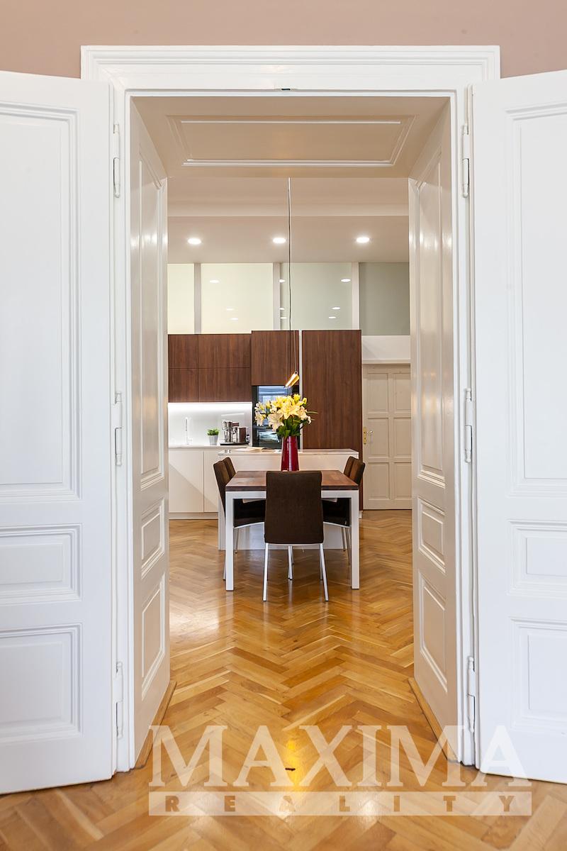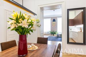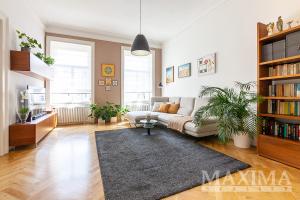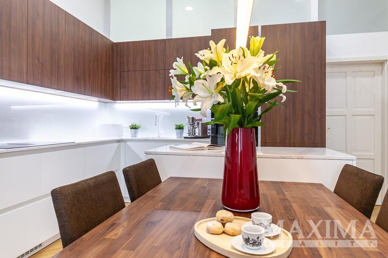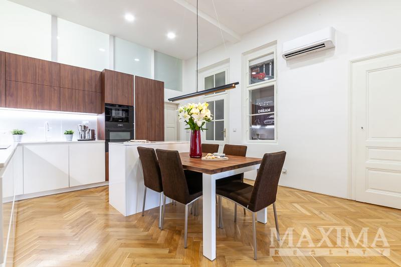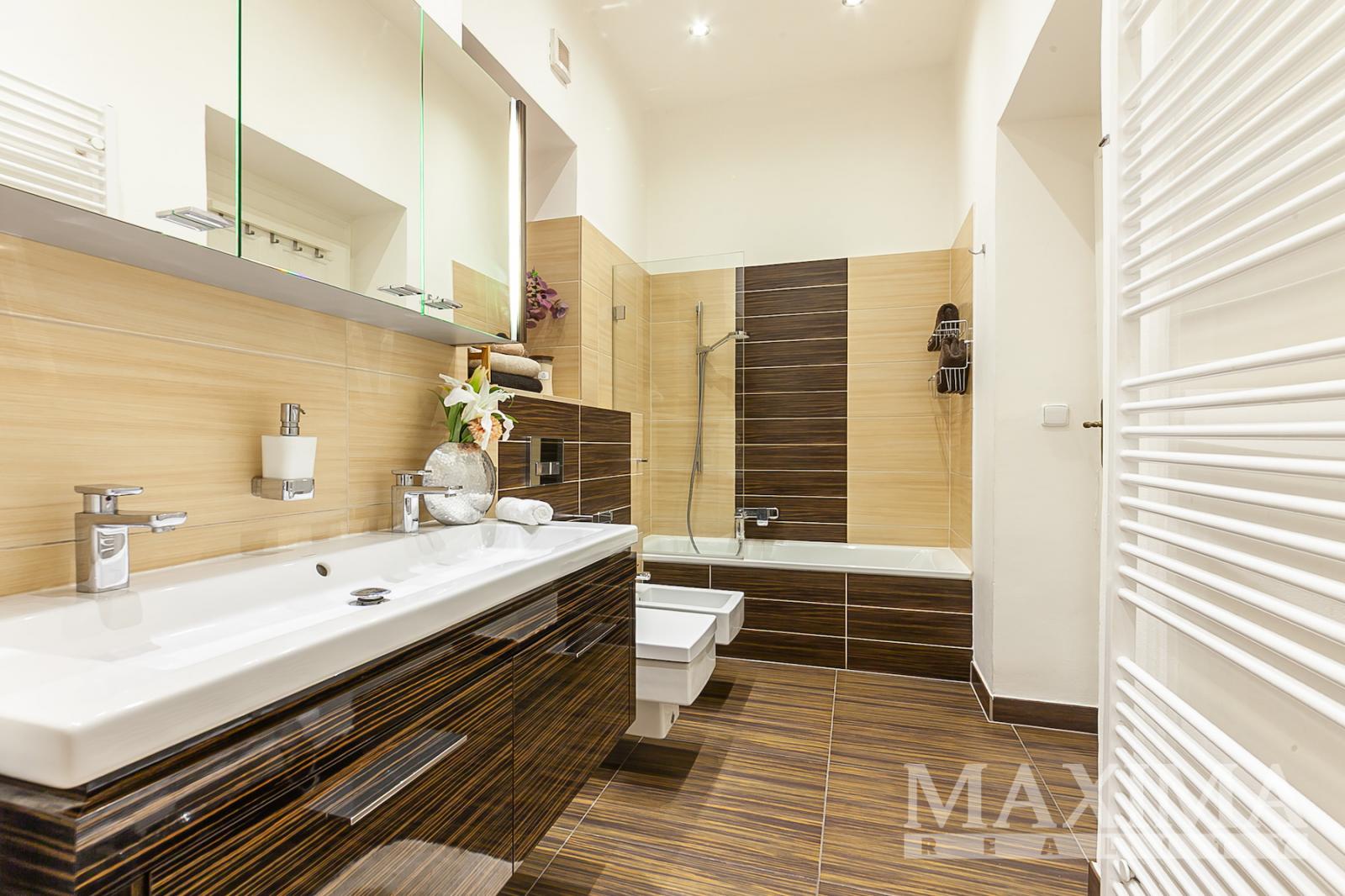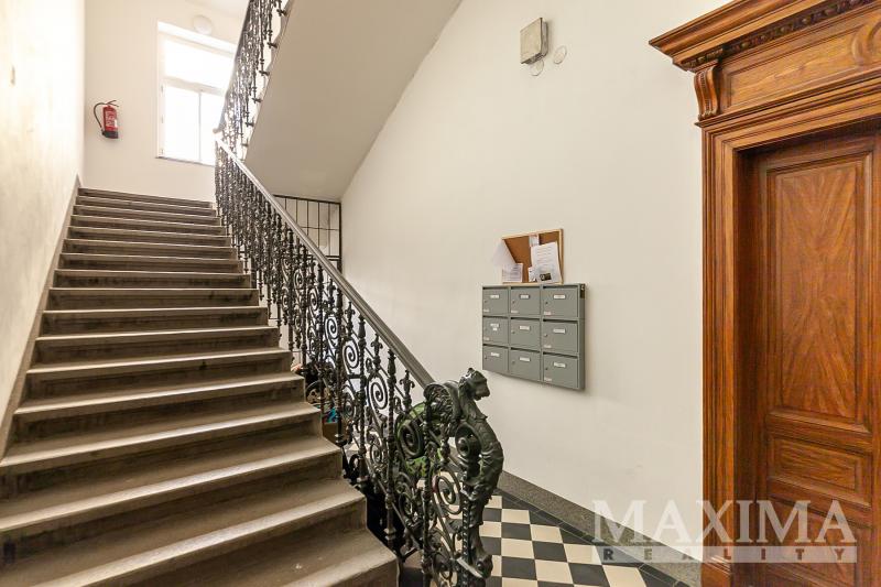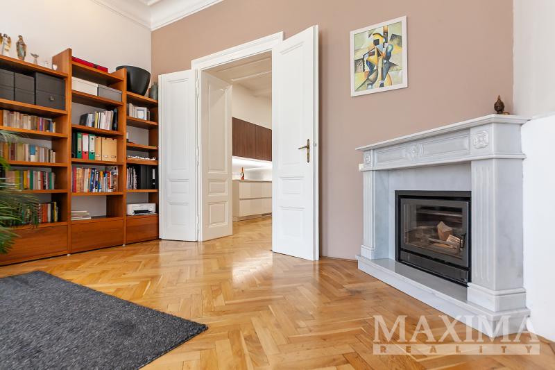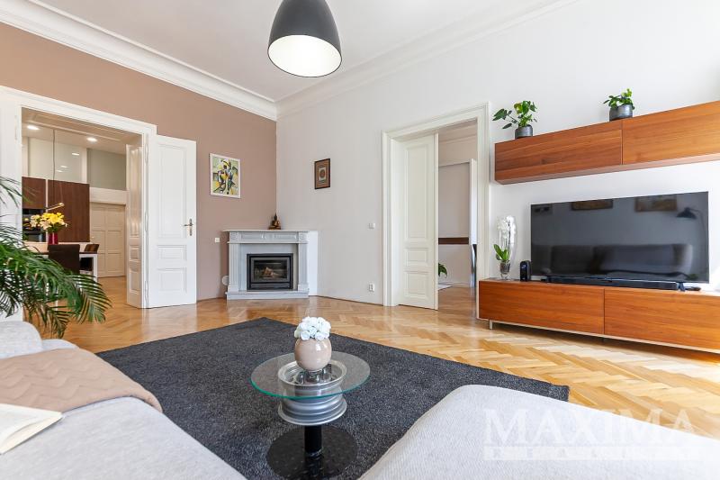 Byt o podlahové ploše 99,2 m2 doplňuje balkonek o velikosti 0,9 m2 a prostorný sklep 7,1 m2, což dohromady nabízí 107,2 m2 užitné plochy včetně příslušenství. Umístěn je ve 2. patře dobře udržovaného historického činžovního domu, který prošel revitalizací. Interiér samotný rovněž prošel nákladnou rekonstrukcí s důrazem na zachování původních architektonických prvků, jako jsou vysoké stropy, a zároveň nabízí moderní design s vybavením nejvyšší kvality, včetně klimatizace a krbu, který navozuje útulnou atmosféru. Jižní orientace bytu zajišťuje dostatek denního světla po celý den.