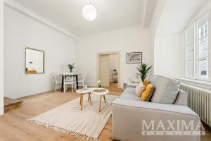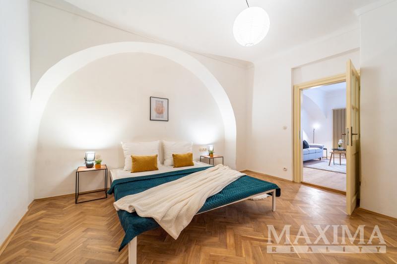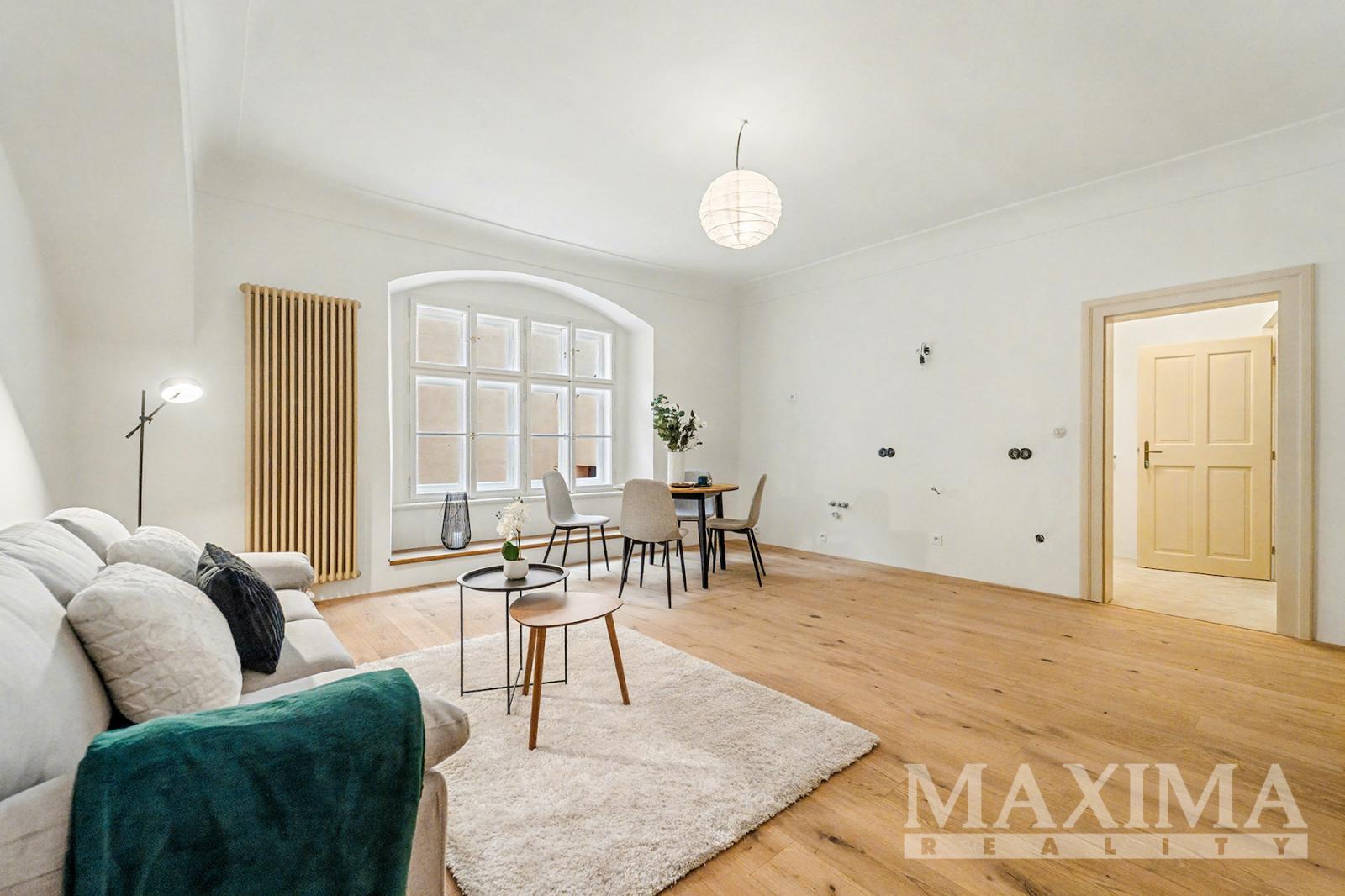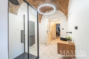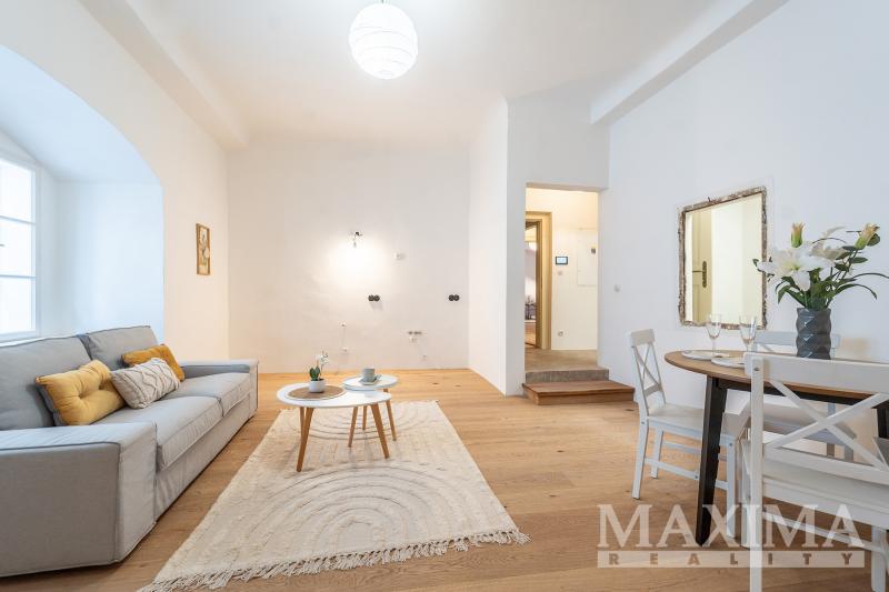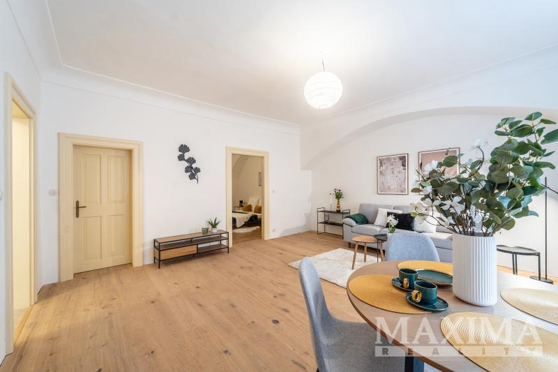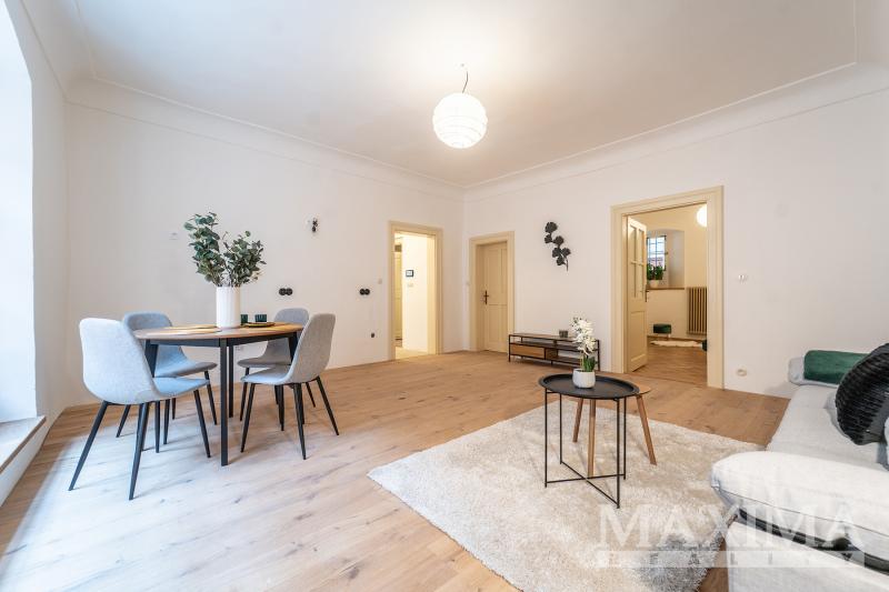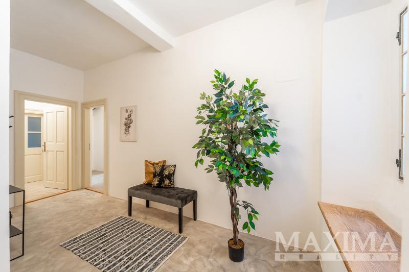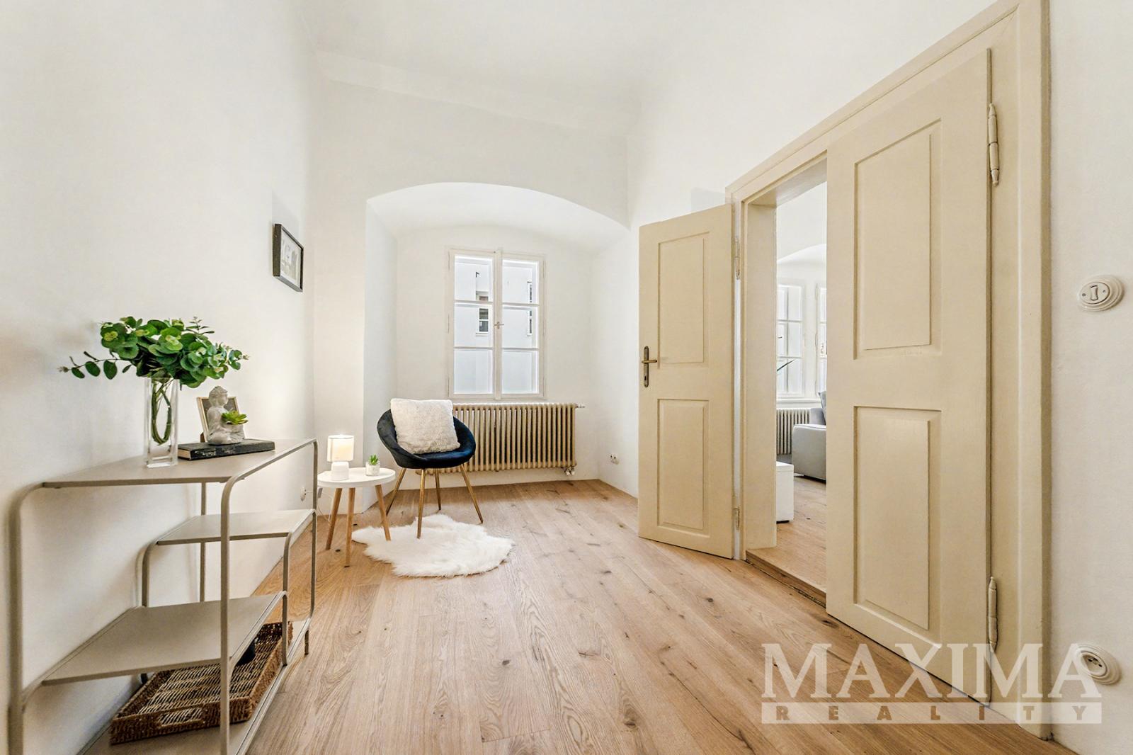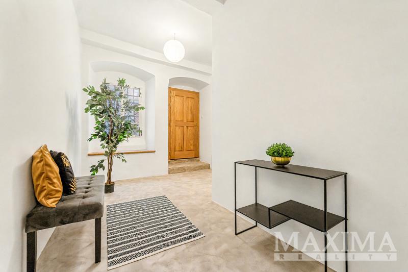 Byt prošel kompletní a nákladnou rekonstrukcí s důrazem na zachování původních architektonických prvků, jako jsou vysoké stropy, renesanční klenby či dřevěná okna, a zároveň nabízí moderní komfort s vybavením nejvyšší kvality. V interiéru naleznete designovou kuchyň vyrobenou na míru truhlářem, systém chytré domácnosti Crestron, sanitární keramiku Laufen a armatury Hansgrohe, spotřebiče Bosch či marocký štuk v koupelnách. Podlahy jsou kombinací dřevěných parket, stěrky a keramické dlažby. V případě zájmu je k dispozici i druhá kuchyňská linka od stejného truhláře. Součástí prodeje je také sklep o velikosti 6,1 m2, komora u bytu 2,8 m2 a k bytu vede společný pavlačový balkon na patře. Rekonstrukce bude dokončena v průběhu října.