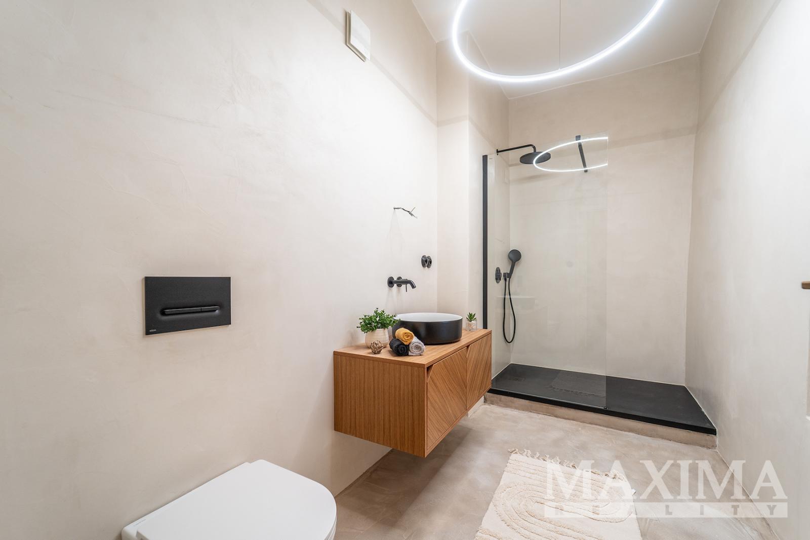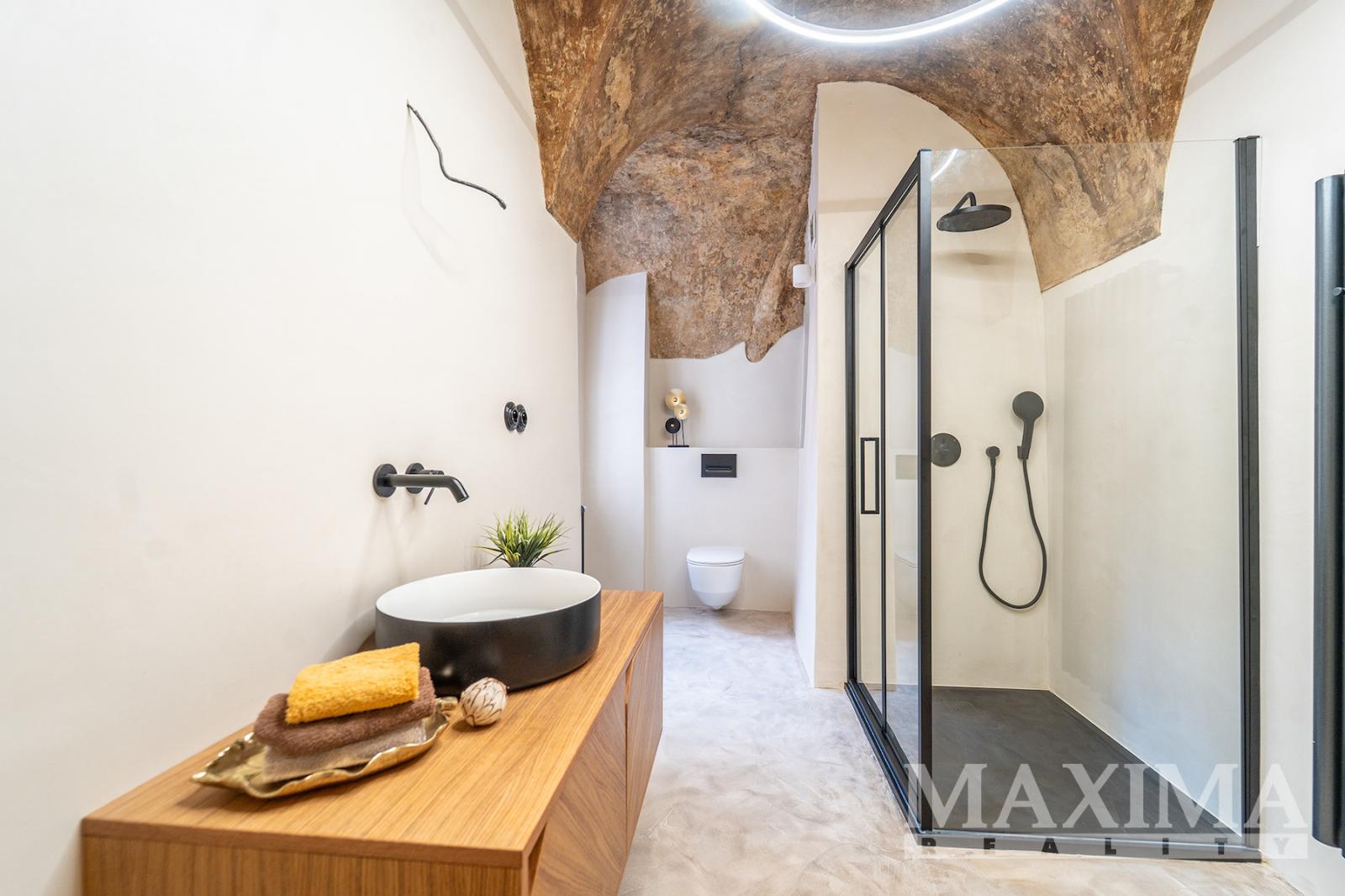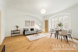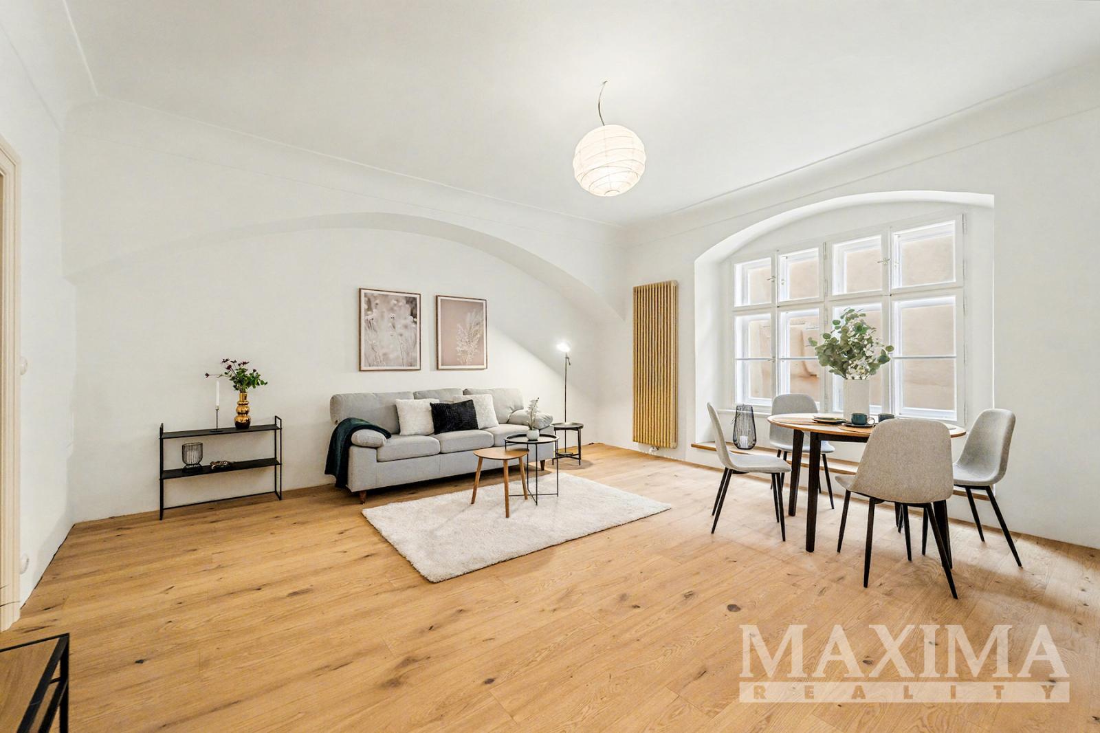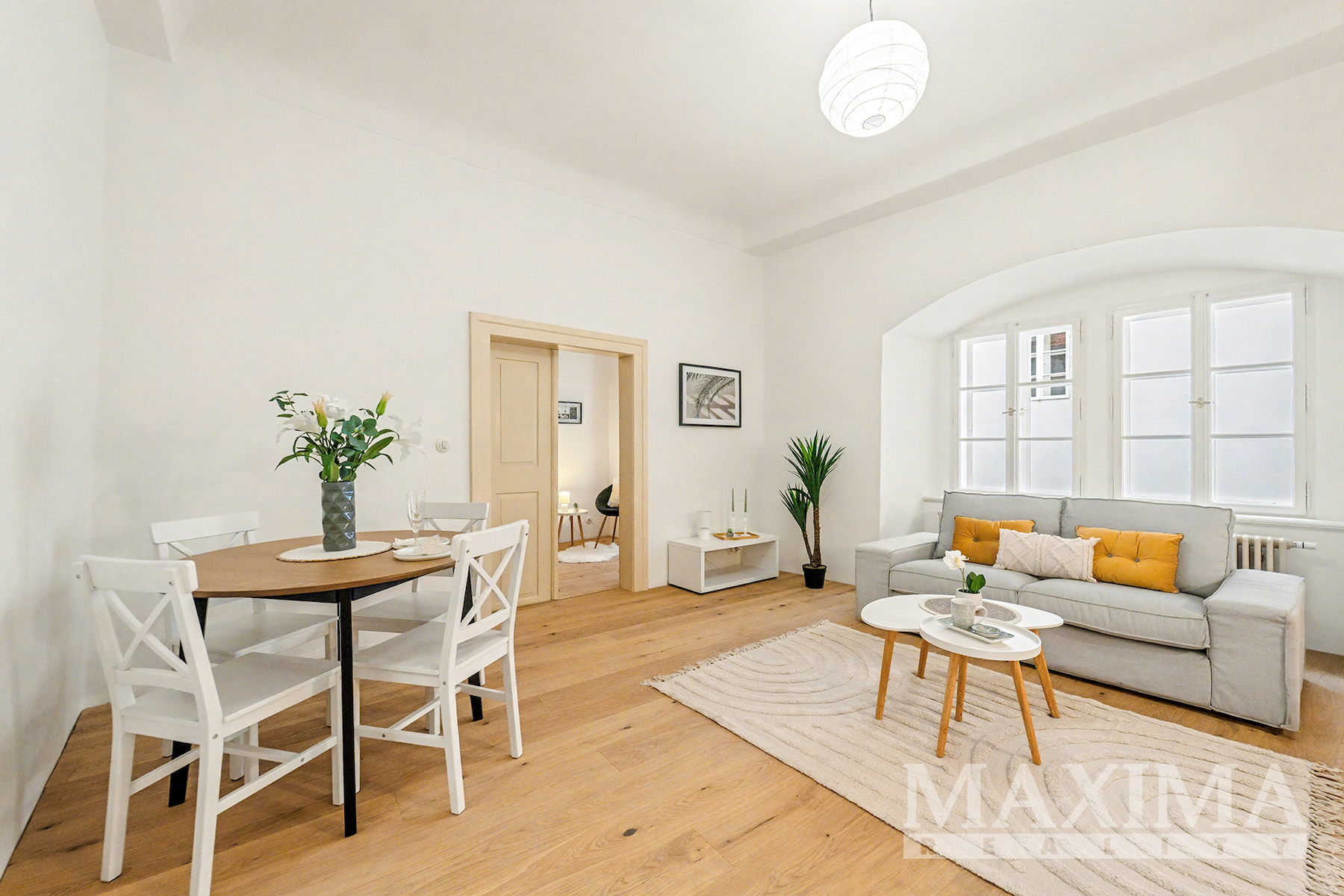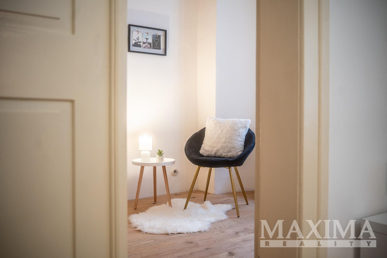 Byt prošel kompletní a nákladnou rekonstrukcí s důrazem na zachování původních architektonických prvků, jako jsou vysoké stropy, renesanční klenby či dřevěná okna, a zároveň nabízí moderní komfort s vybavením nejvyšší kvality. V interiéru naleznete designovou kuchyň vyrobenou na míru truhlářem, systém chytré domácnosti Crestron, sanitární keramiku Laufen a armatury Hansgrohe, spotřebiče Bosch či marocký štuk v koupelnách. Podlahy jsou kombinací dřevěných parket, stěrky a keramické dlažby. V případě zájmu je k dispozici i druhá kuchyňská linka od stejného truhláře. Součástí prodeje je také sklep o velikosti 6,1 m2, komora u bytu 2,8 m2 a k bytu vede společný pavlačový balkon na patře. Rekonstrukce bude dokončena v průběhu října.