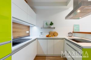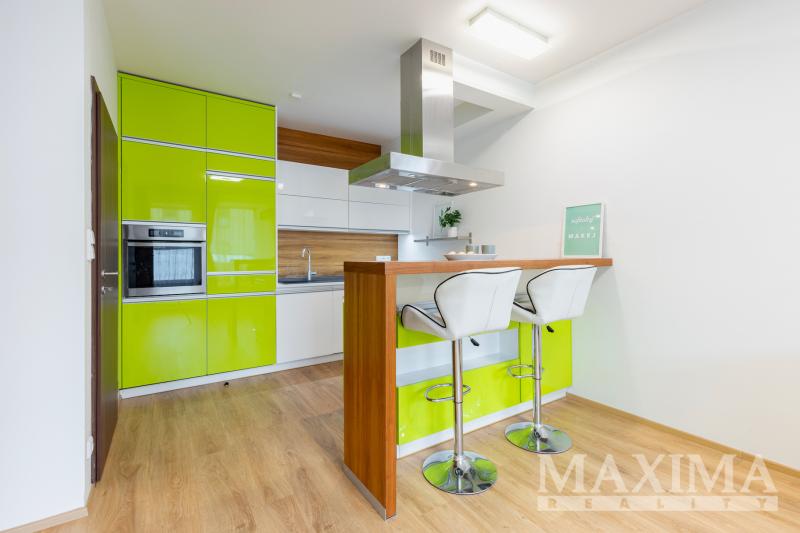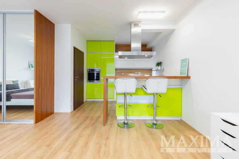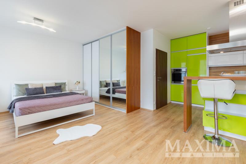 Součástí prodeje je moderní kuchyňská linka se spotřebiči (indukce, digestoř, myčka, lednice), jídelní pult, vestavěné skříně na míru, postel a osvětlení. Koupelna má zděné jádro, vanu a WC. K bytu náleží garážové parkovací stání, nízké měsíční poplatky cca 5 300 Kč. Klidná lokalita s veškerou občanskou vybaveností a skvělou dopravní dostupností. Osobní vlastnictví, možnost okamžitého nastěhování.