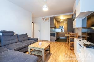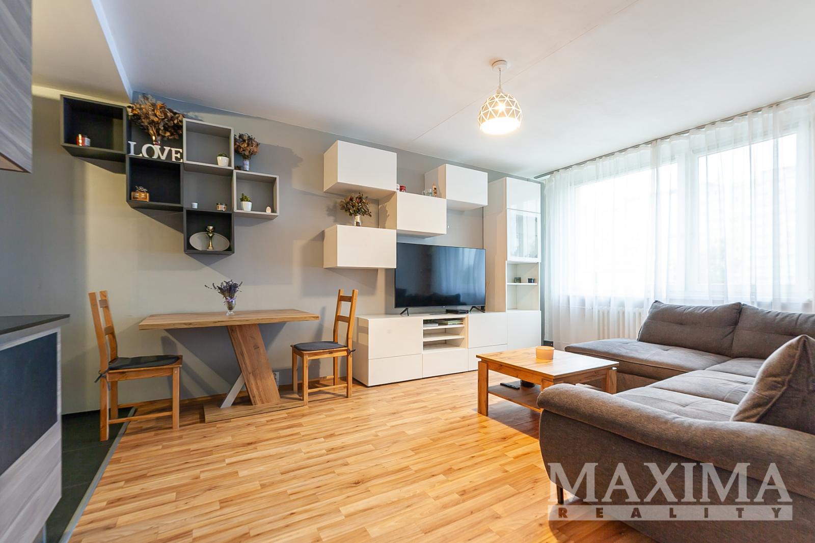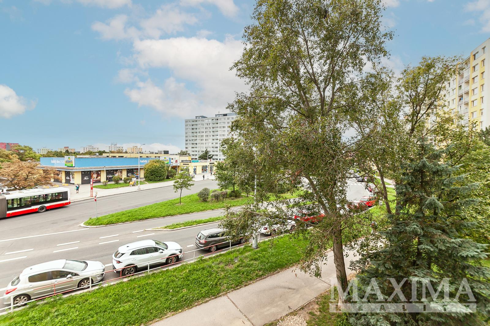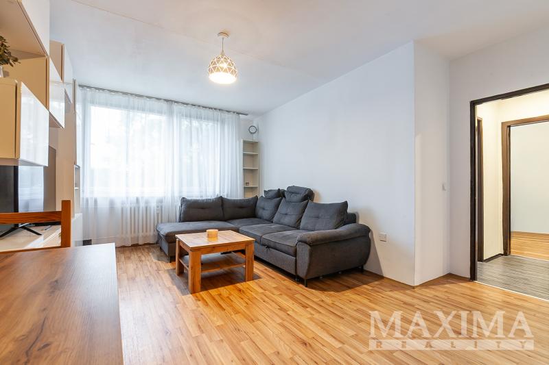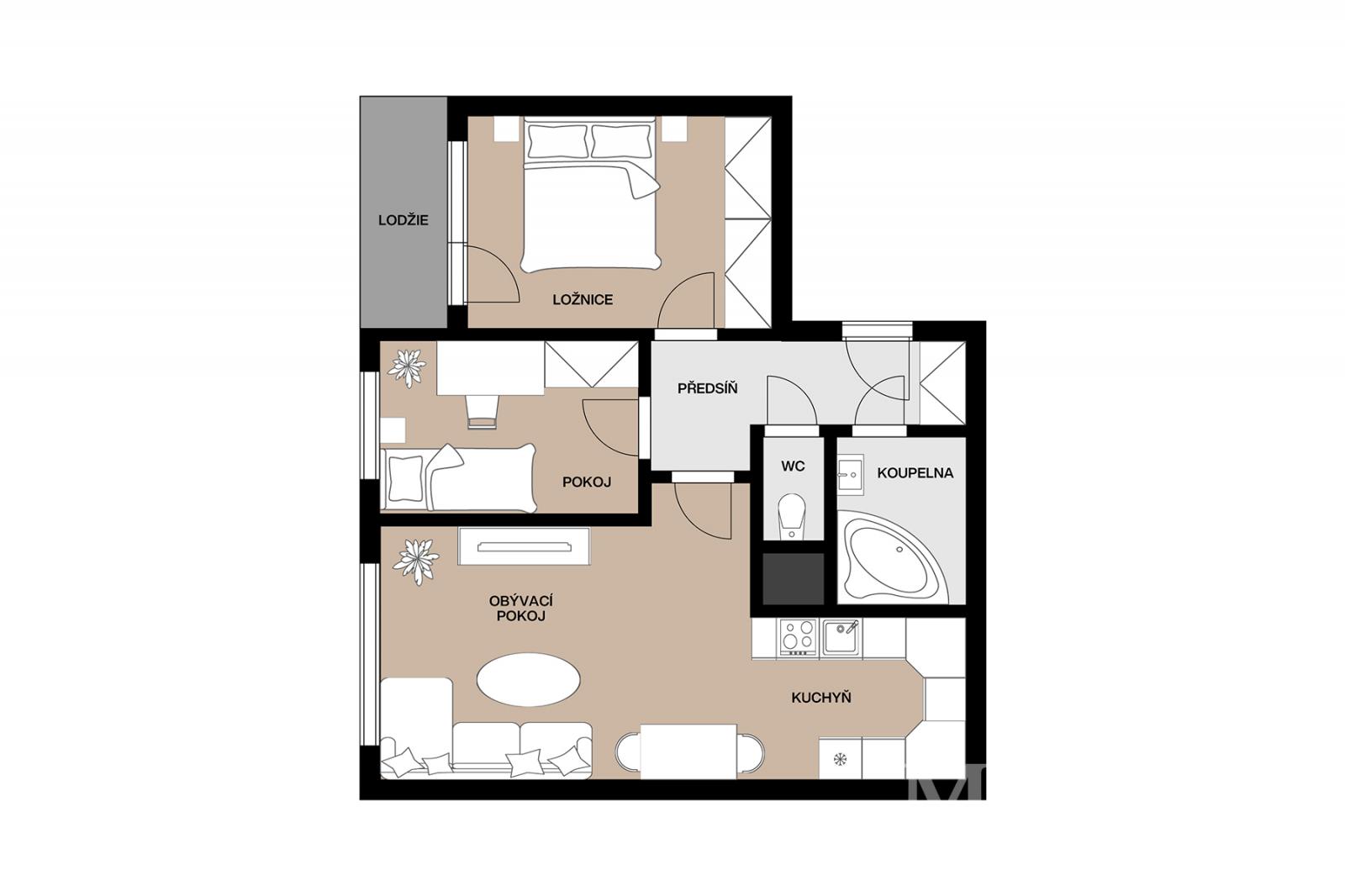 Dispozice bytu nabízí obývací pokoj 18 m2 s kuchyňským koutem o velikosti 6 m2, ložnice 8,1 m2, pokoj 11,5 m2 se vstupem na lodžii o velikosti 2,8 m2, předsíň 6,6 m2, koupelna s vanou 2,8 m2, samostatné WC 0,9 m2. K bytu náleží sklepní kóje o velikosti 2 m2.