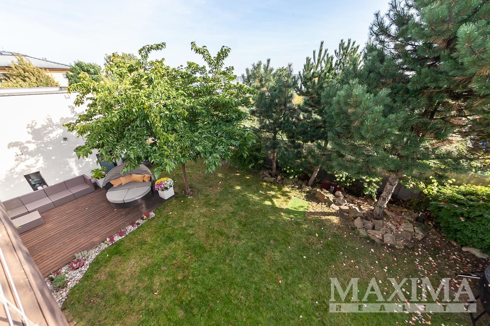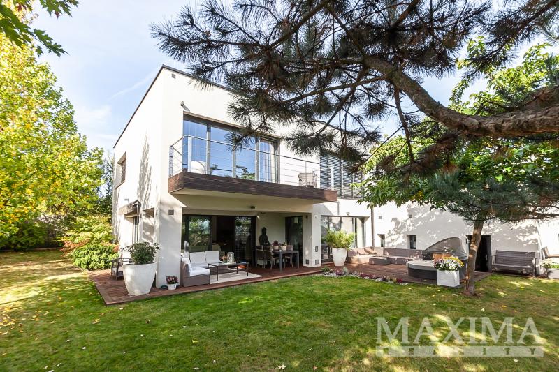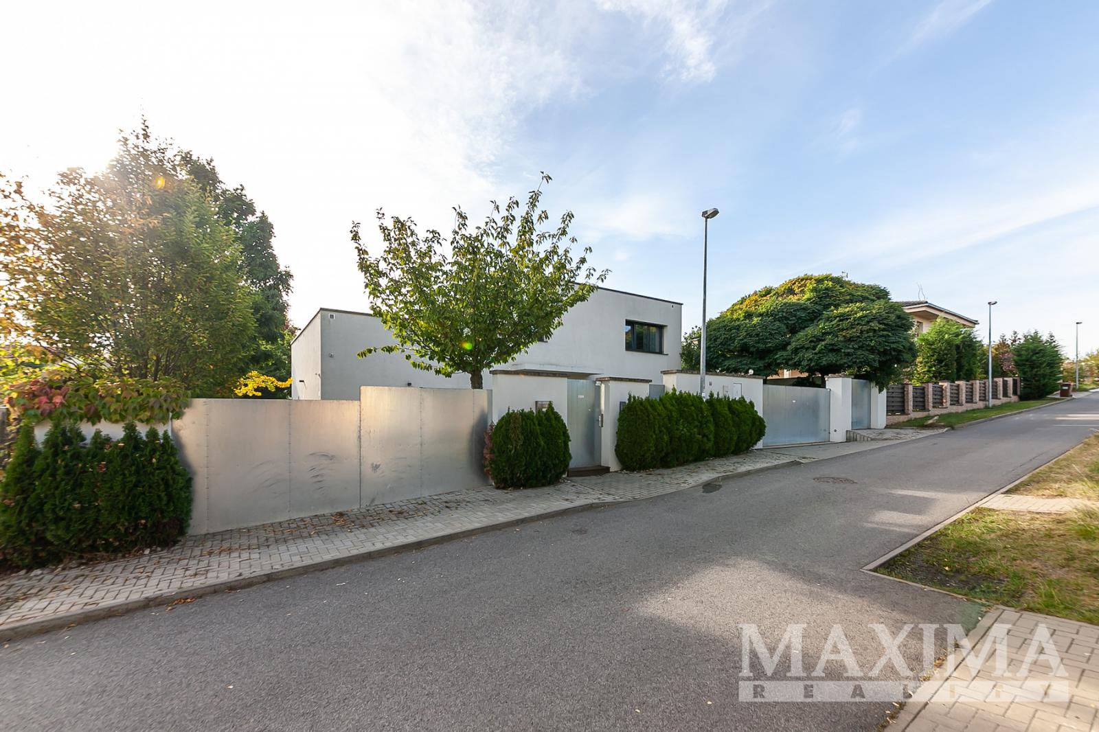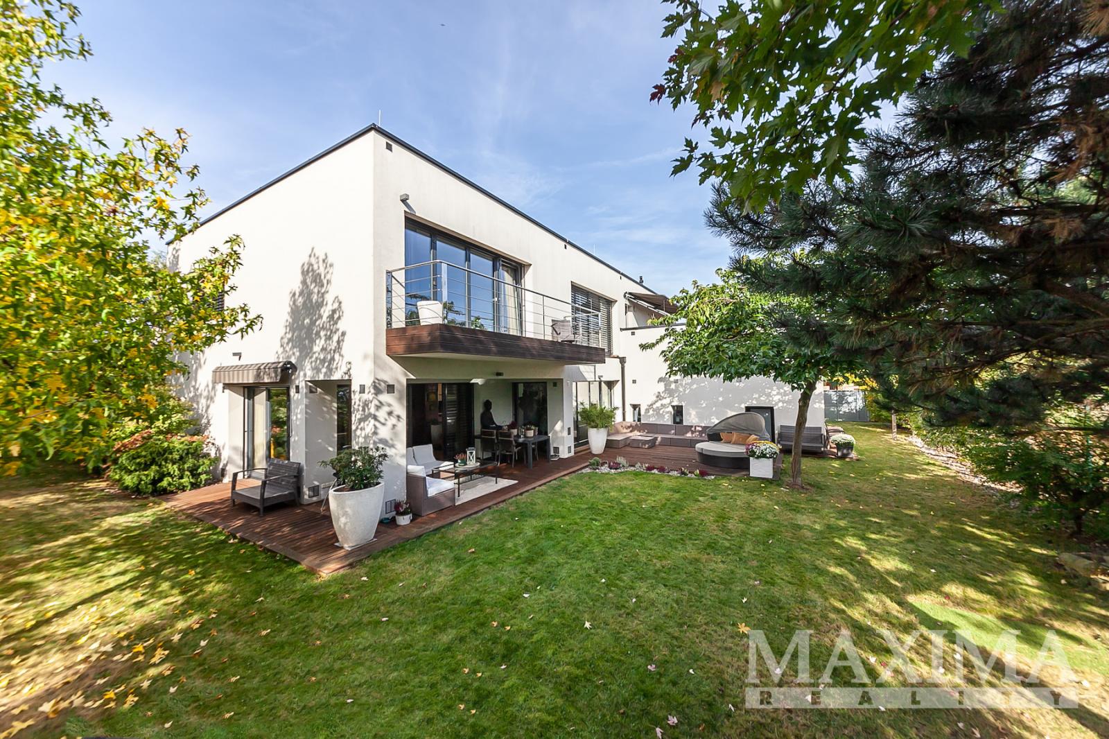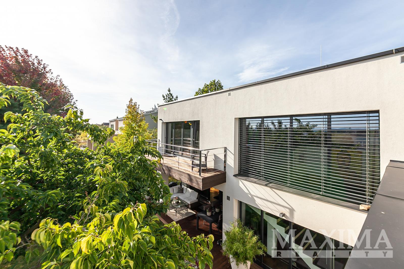 Ve výhradním zastoupení majitele nabízíme exkluzivní rezidenci s vyváženou funkční a estetickou kvalitou, citlivě vkomponovanou na parcelu s naprostým soukromím, která je součástí prestižní komorní vilové zástavby v lokalitě Višňovka. Osloví Vás atmosféra decentního luxusu, elegantního nadčasového designu, jedinečný výhled, klid a soukromí i promyšlené provozně dispoziční řešení a perfekcionistické provedení nemovitosti od konceptu po detail. Dispozice vily, 5+kk se systémem teras, 3 garážemi, 3 koupelnami, 3 WC, technickou místností a dalším zázemím, je rozložena ve 2 plnohodnotných podlažích. Prostorově velkorysý dům, s užitnou plochou 411 m2, těží z provázanosti interiéru s exteriérem: terasy poskytují výhledy (např. terasa o ploše 50 m2 ve 2. NP) i naprostou intimitu a soukromí (terasa v 1. NP vzhledem k půdorysnému tvaru domu i vzrostlé zeleni). Špičkové použité prvky a vybavení: zateplená odvětrávaná fasáda na nosném zdivu z Porothermu, benátské štuky, dřevěná okna s trojskly, elektricky ovládané žaluzie, klimatizace, podlahové topení, kamerový systém, víceokruhový alarm, osvětlení na čidla, internet optický kabel, vyhřívaný vjezd, osvětlení a automatické zavlažování zahrady, rezervoár na dešťovou vodu, aj. Na pozemku o rozloze 828 m2 profesionálně ztvárněná vzrostlá okrasná zahrada se vzácnými dřevinami, naprostým soukromím, docíleným tvarem domu, plným oplocením i vzrostlou zelení, dále např. zahradní domek a dostatečná zpevněná parkovací plocha přístupná několika vjezdy. Lze nabýt včetně movitého vybavení. Výjimečná nemovitost představuje reprezentativní, uživatelsky komfortní, moderní bydlení v rezidenční čtvrti v sousedství rezervace, současně s rychlou dostupností M i centra metropole. Hypotéka lze, rádi Vám zařídíme.