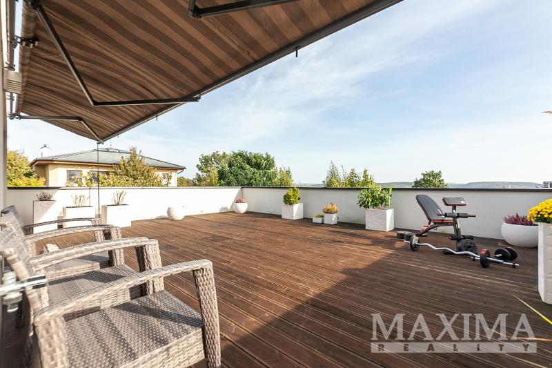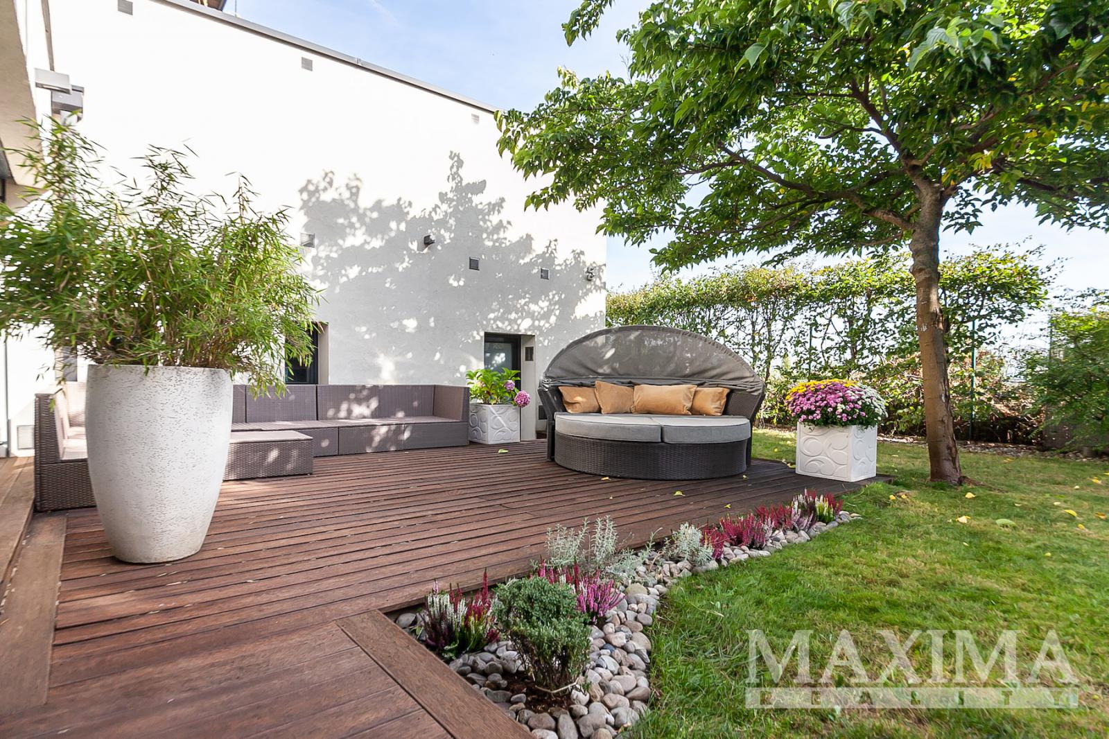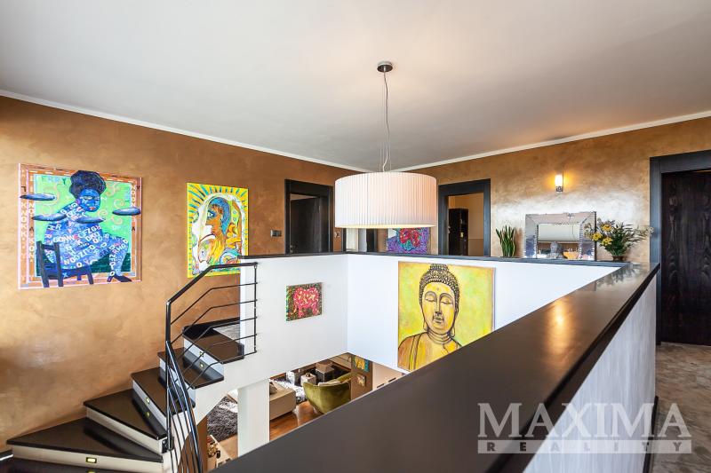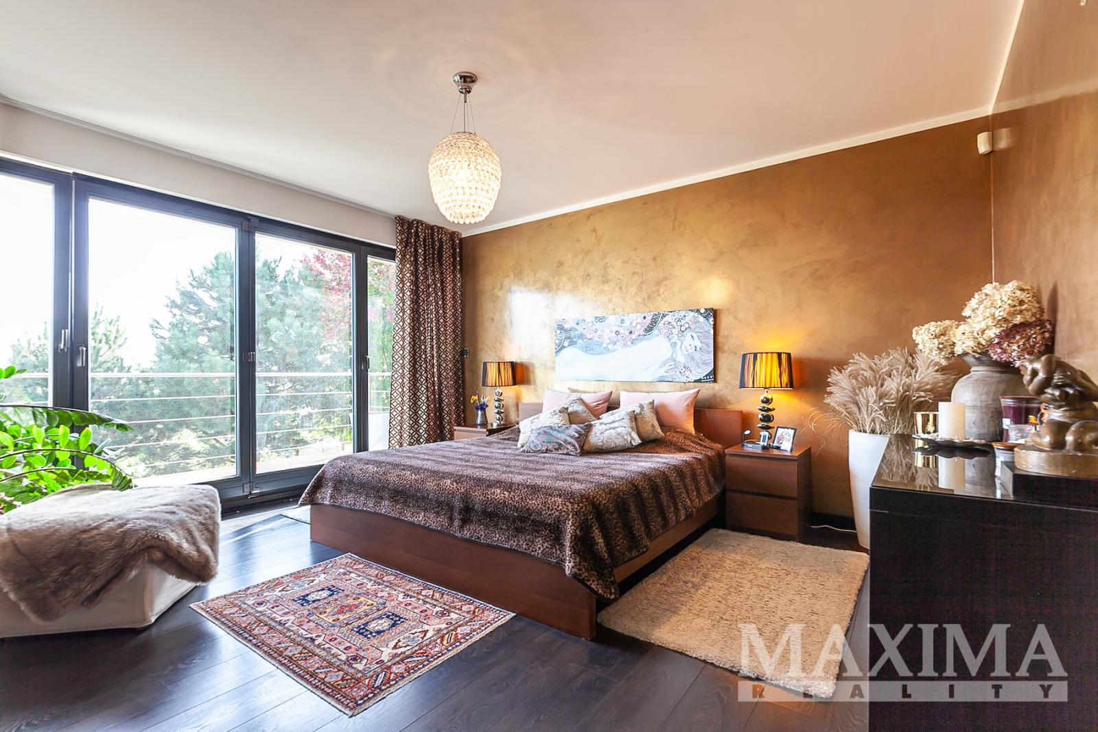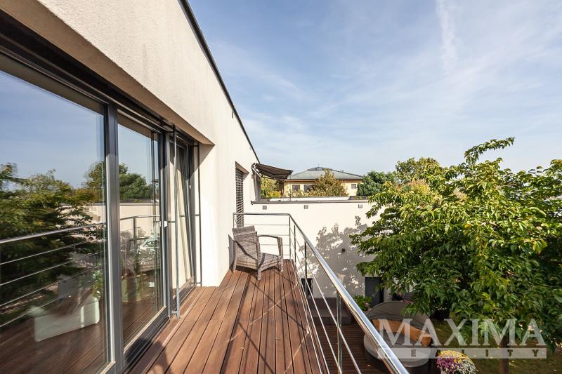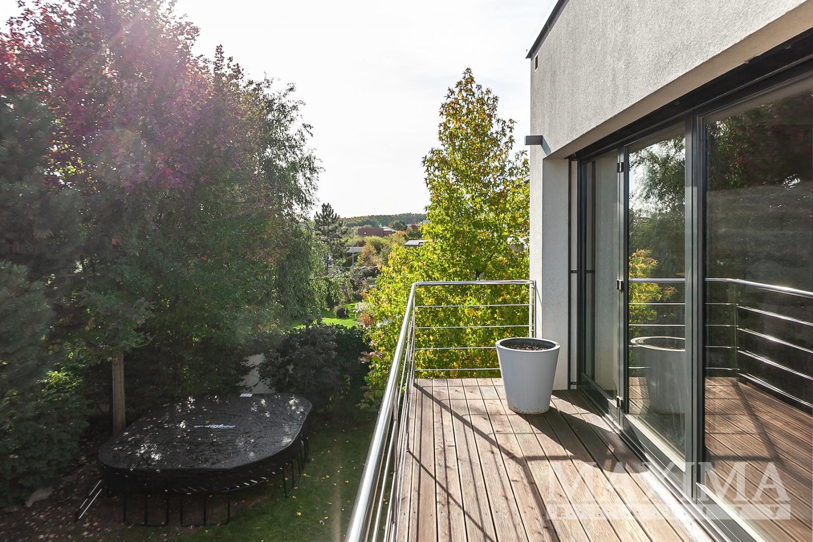 Ve výhradním zastoupení majitele nabízíme exkluzivní rezidenci s vyváženou funkční a estetickou kvalitou, citlivě vkomponovanou na parcelu s naprostým soukromím, která je součástí prestižní komorní vilové zástavby v lokalitě Višňovka. Osloví Vás atmosféra decentního luxusu, elegantního nadčasového designu, jedinečný výhled, klid a soukromí i promyšlené provozně dispoziční řešení a perfekcionistické provedení nemovitosti od konceptu po detail. Dispozice vily, 5+kk se systémem teras, 3 garážemi, 3 koupelnami, 3 WC, technickou místností a dalším zázemím, je rozložena ve 2 plnohodnotných podlažích. Prostorově velkorysý dům, s užitnou plochou 411 m2, těží z provázanosti interiéru s exteriérem: terasy poskytují výhledy (např. terasa o ploše 50 m2 ve 2. NP) i naprostou intimitu a soukromí (terasa v 1. NP vzhledem k půdorysnému tvaru domu i vzrostlé zeleni). Špičkové použité prvky a vybavení: zateplená odvětrávaná fasáda na nosném zdivu z Porothermu, benátské štuky, dřevěná okna s trojskly, elektricky ovládané žaluzie, klimatizace, podlahové topení, kamerový systém, víceokruhový alarm, osvětlení na čidla, internet optický kabel, vyhřívaný vjezd, osvětlení a automatické zavlažování zahrady, rezervoár na dešťovou vodu, aj. Na pozemku o rozloze 828 m2 profesionálně ztvárněná vzrostlá okrasná zahrada se vzácnými dřevinami, naprostým soukromím, docíleným tvarem domu, plným oplocením i vzrostlou zelení, dále např. zahradní domek a dostatečná zpevněná parkovací plocha přístupná několika vjezdy. Lze nabýt včetně movitého vybavení. Výjimečná nemovitost představuje reprezentativní, uživatelsky komfortní, moderní bydlení v rezidenční čtvrti v sousedství rezervace, současně s rychlou dostupností M i centra metropole. Hypotéka lze, rádi Vám zařídíme.