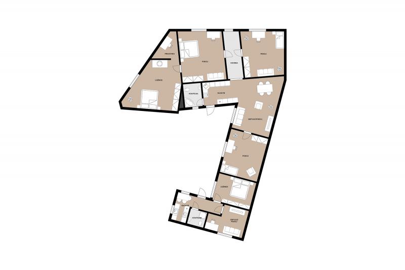5 prostorných pokojů, z nichž jeden je velký obývací pokoj s krbem, ideální pro relaxaci i rodinné oslavy