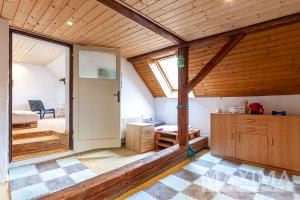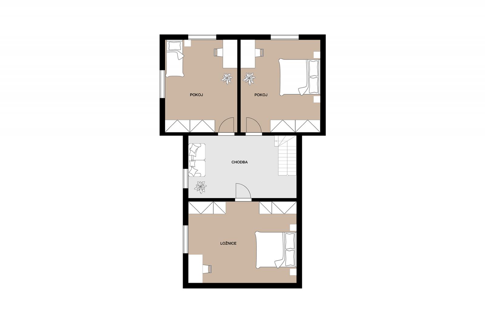 V přízemí domu se nachází prostorná vstupní chodba, kuchyň s jídelnou a praktickou spíží, obývací pokoj s krbovými kamny, koupelna s vanou a samostatné WC. V patře se nachází vstupní prostor přímo ze schodiště a tři samostatné pokoje, ze kterých je ojedinělý výhled do okolí a na vrch Blaník. Dále téměř 60m2 půdního prostoru, který lze s trochou inspirace využít k rozšíření další obytné plochy.