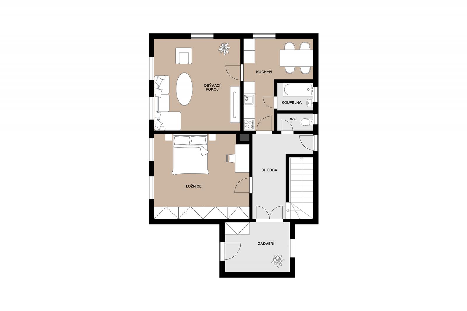 V patře domu najdete bytovou jednotku 3+1 o velikosti 70 m2 + zastřešená terasa 21,6 m2 s dispozicí - obývací pokoj se vstupem na terasu, ložnice, pokoj, kuchyň, koupelna s vanou a WC, vstup do půdního prostoru.