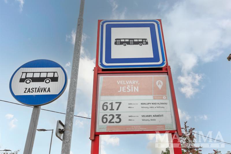 Autobusová zastávka Velvary – Ješín se nachází jen 50 metrů od pozemku a zajišťuje spojení do okolních měst, jako jsou Velvary, Kralupy nad Vltavou nebo Slaný, kde je k dispozici kompletní občanská vybavenost. Do Prahy (části Praha 6 nebo 9) se autem dostanete do 25 minut.