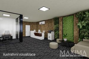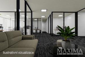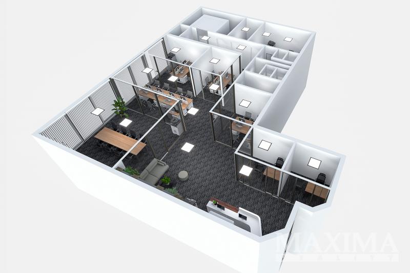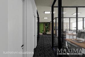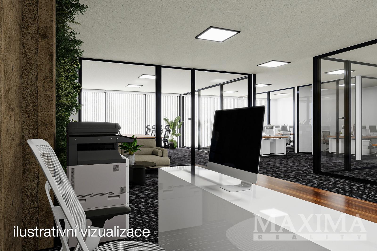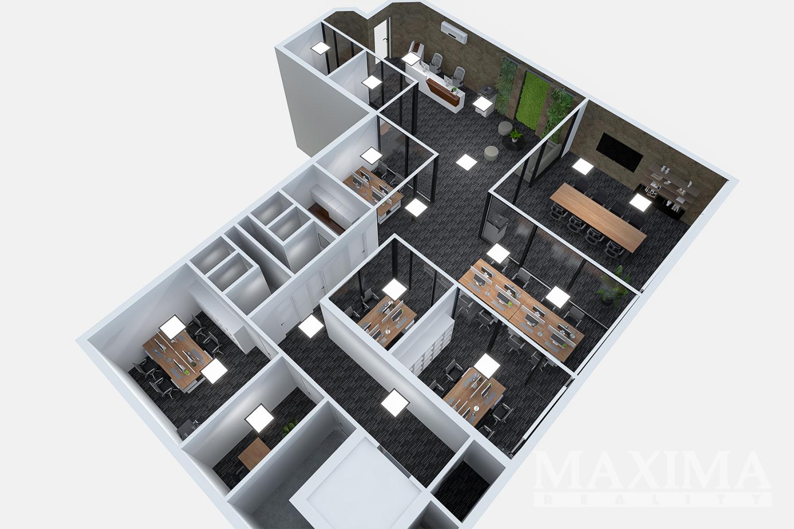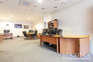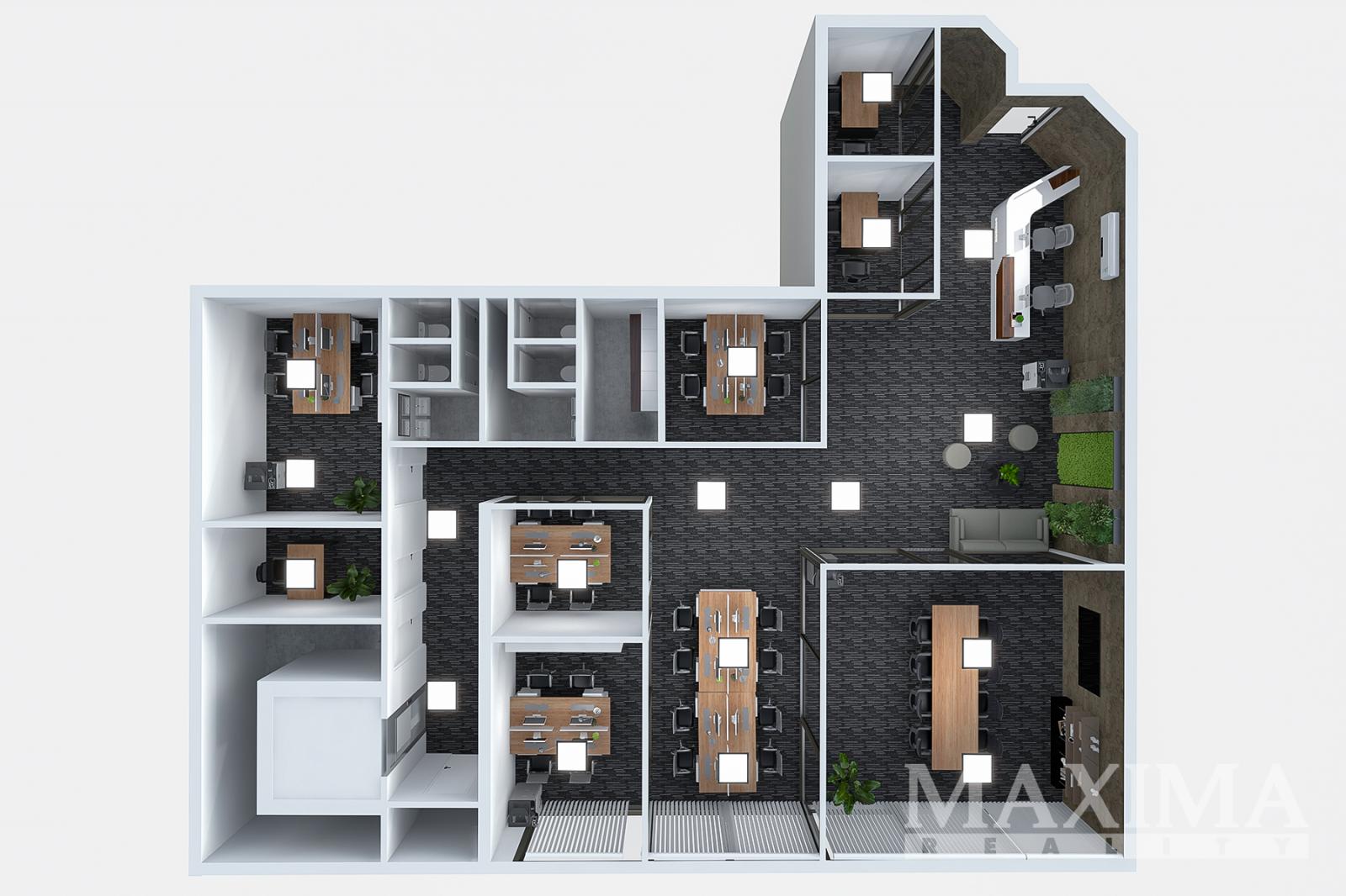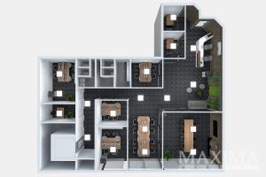 Celková plocha činí 227,4 m2. Dispozice zahrnuje zádveří, dvě prostorné kanceláře s velkými okny, dvě menší kanceláře, kuchyňku, sociální zázemí, komoru a serverovnu.